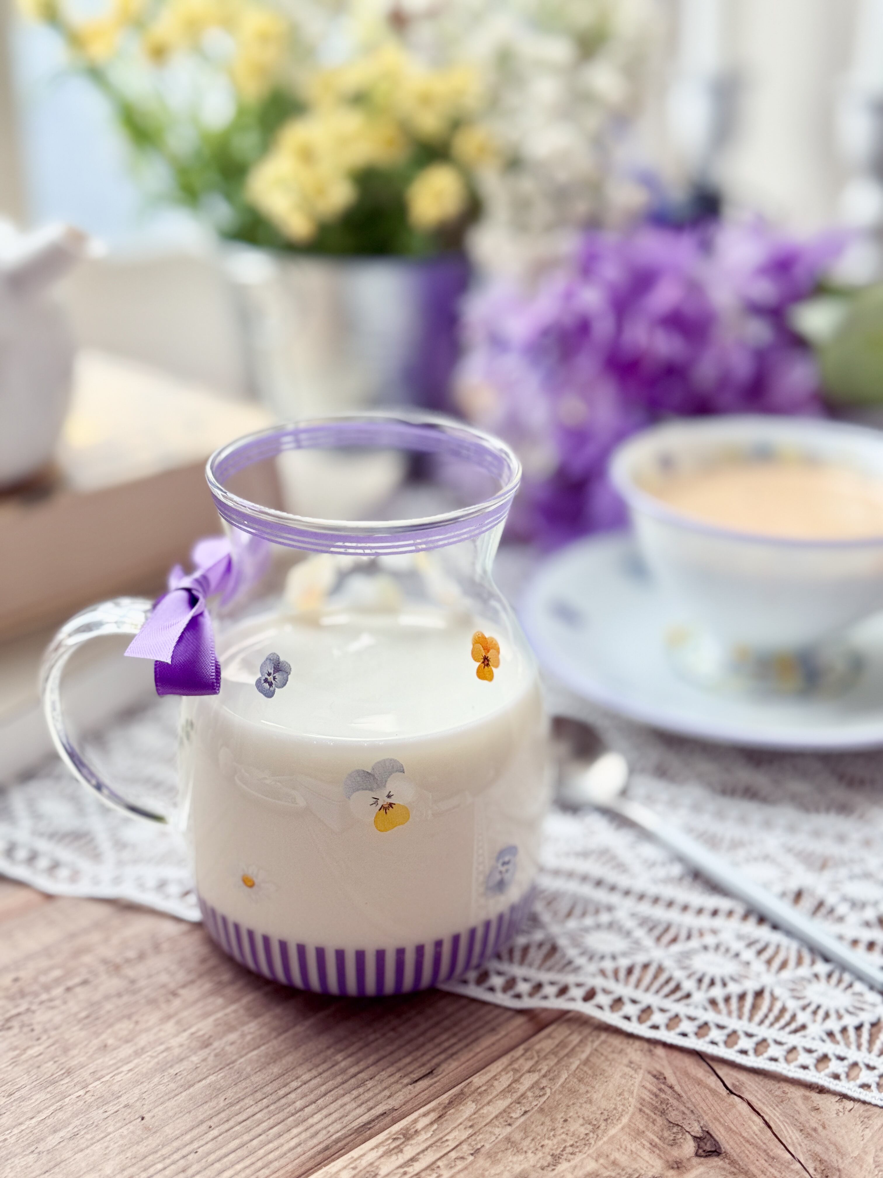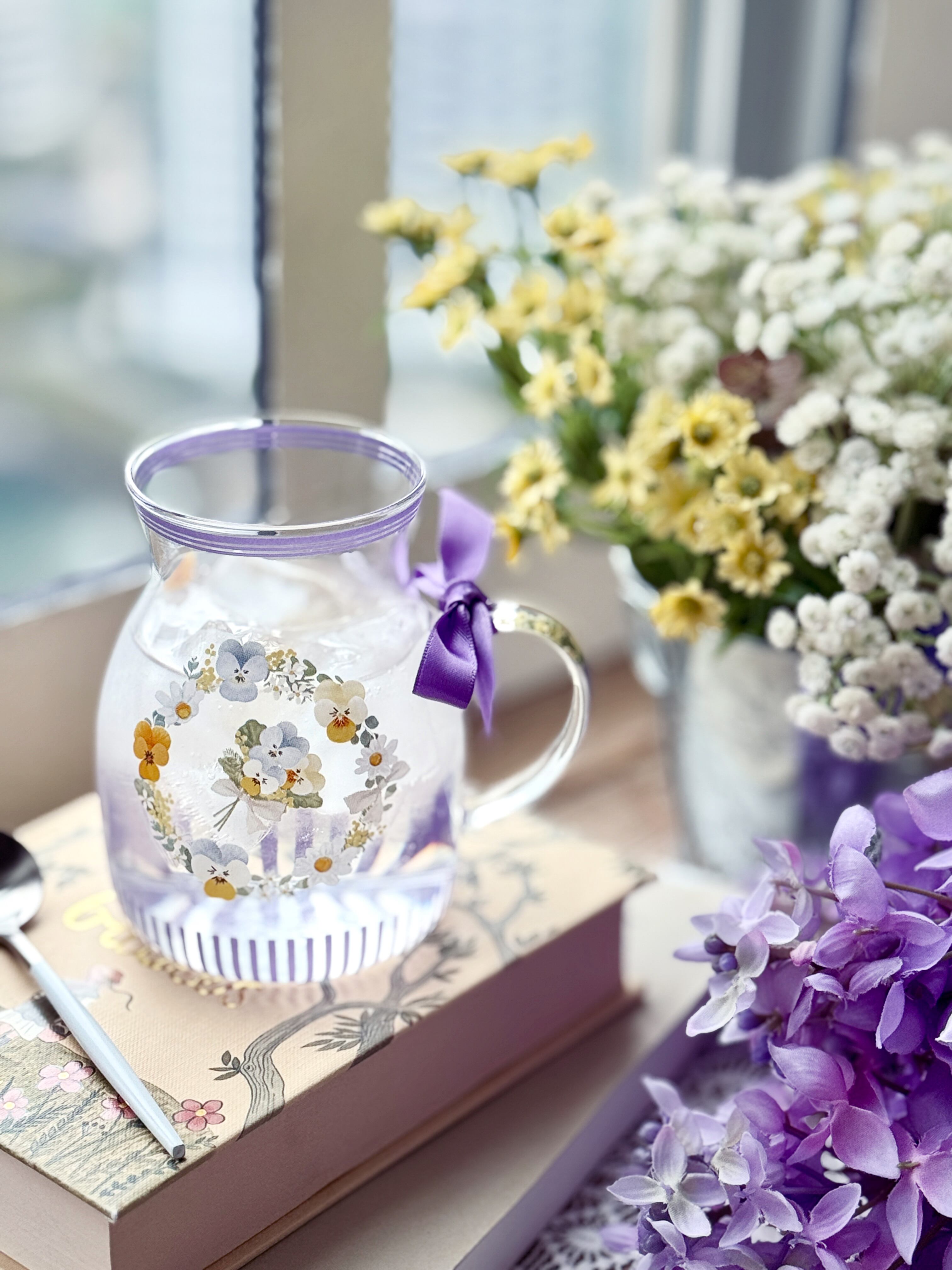 北欧風フローラルパンジーリース転写紙を使ったガラスのピッチャーです。