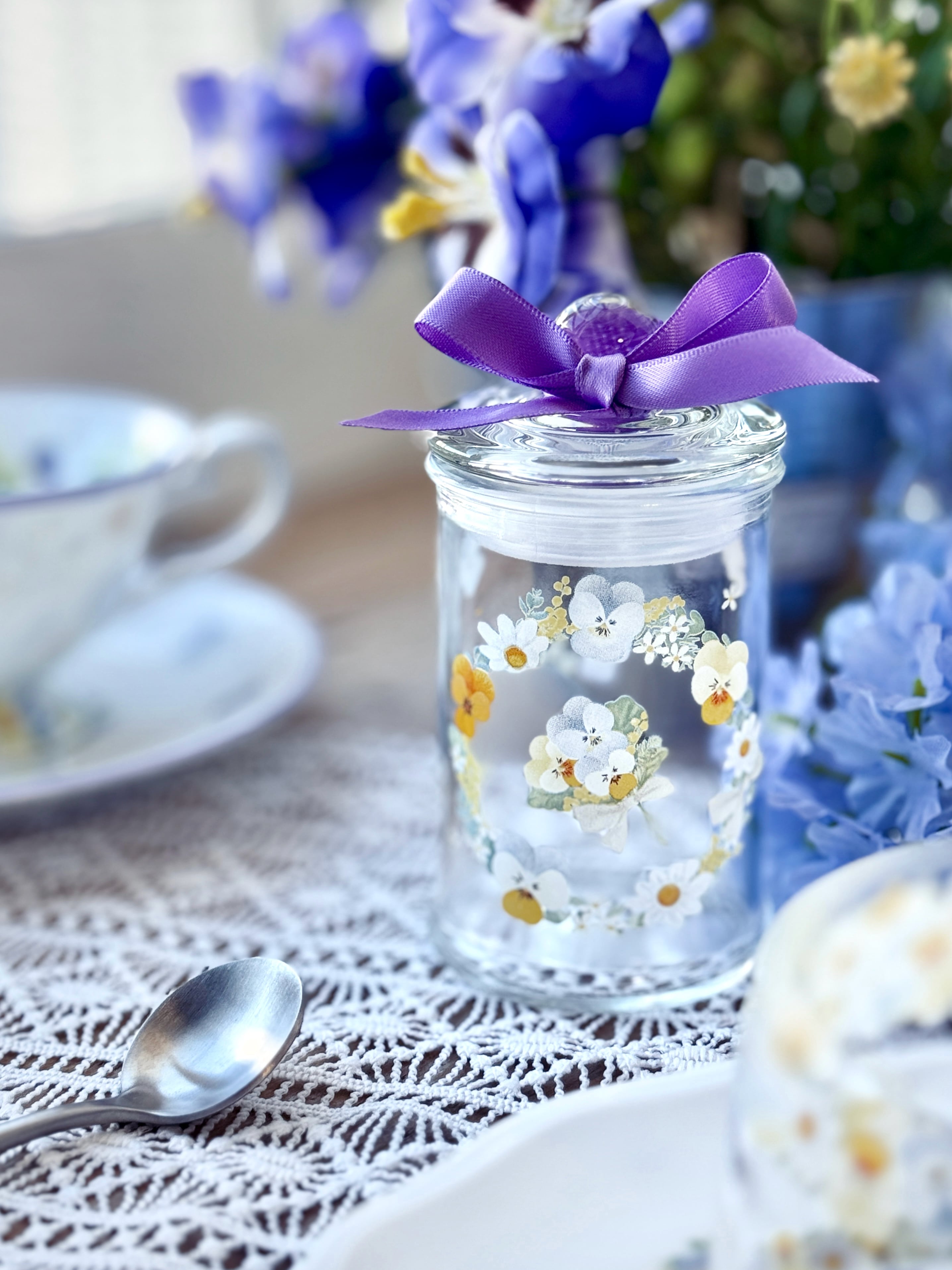 北欧風フローラルパンジーリース転写紙を使ったガラスのキャニスターです。