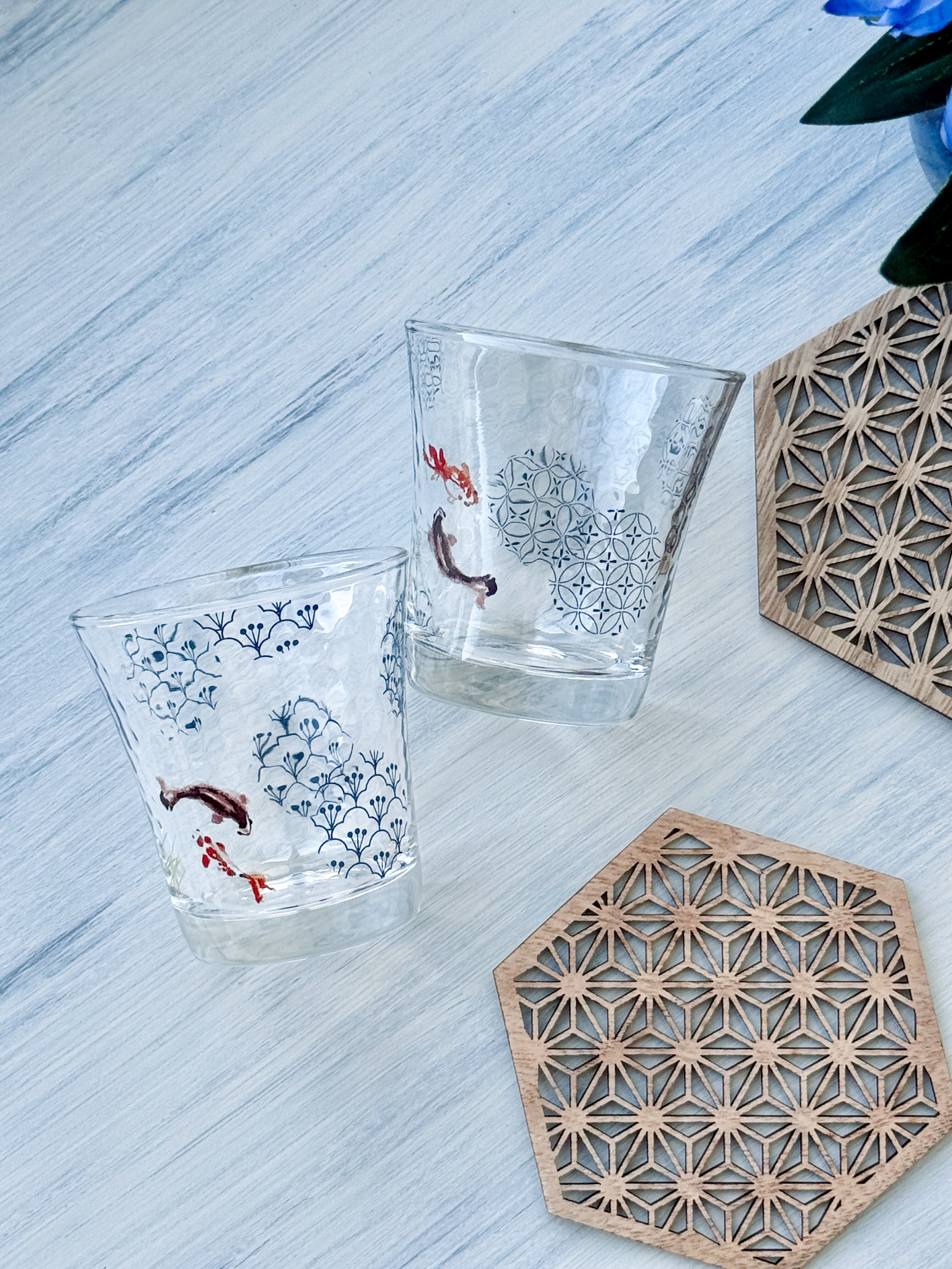 藍色の和柄と金魚が泳ぐ和テイストのガラスの冷酒カップ2個セットです。
