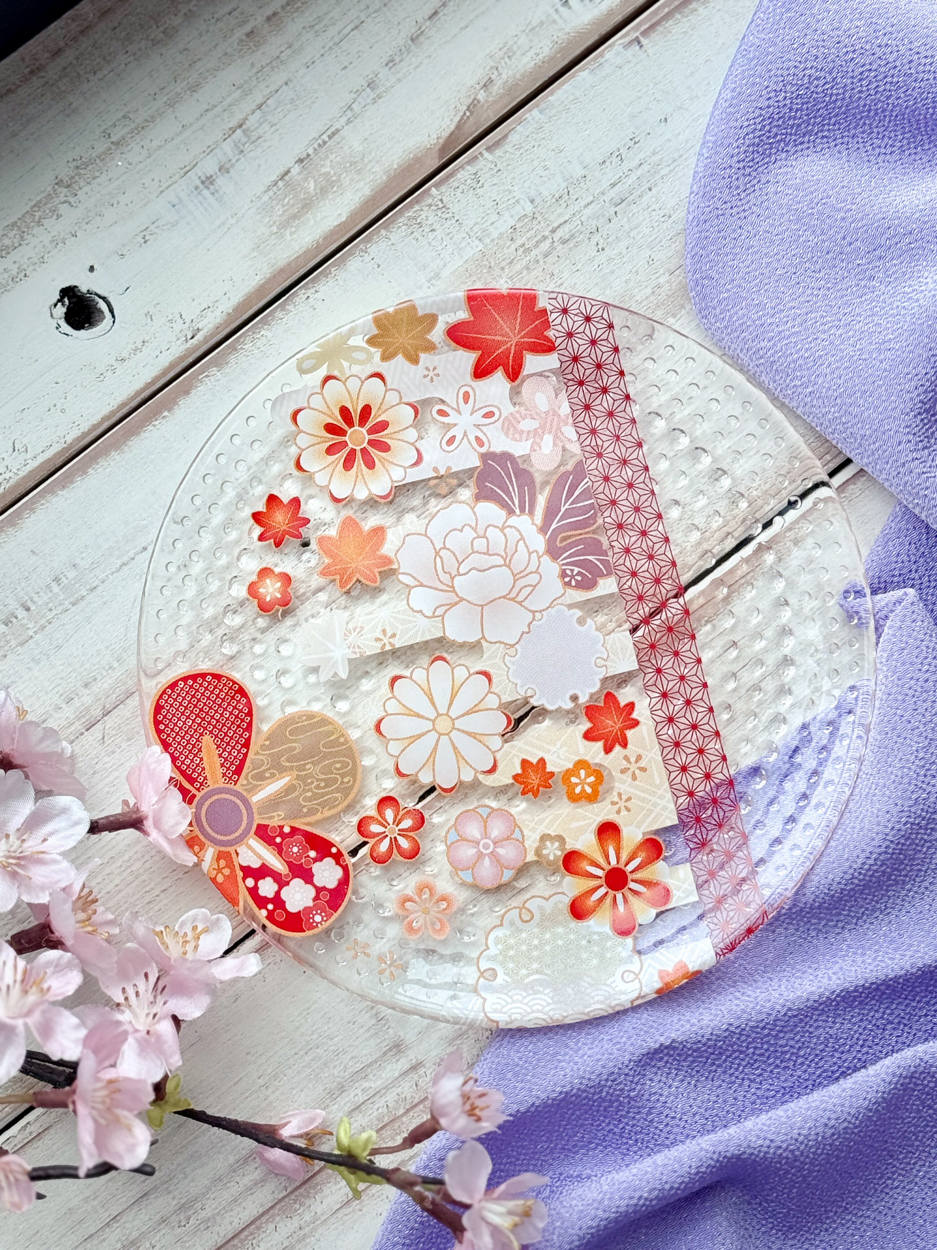華やかな和柄のガラスプレートです。